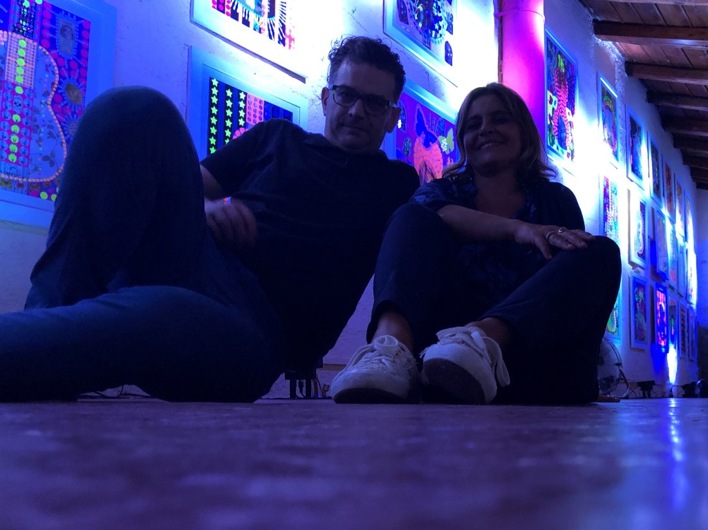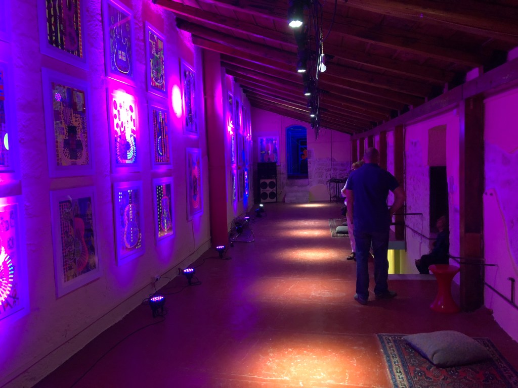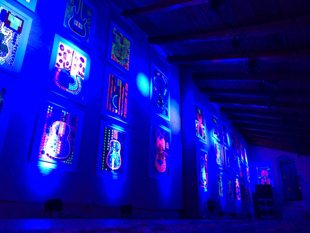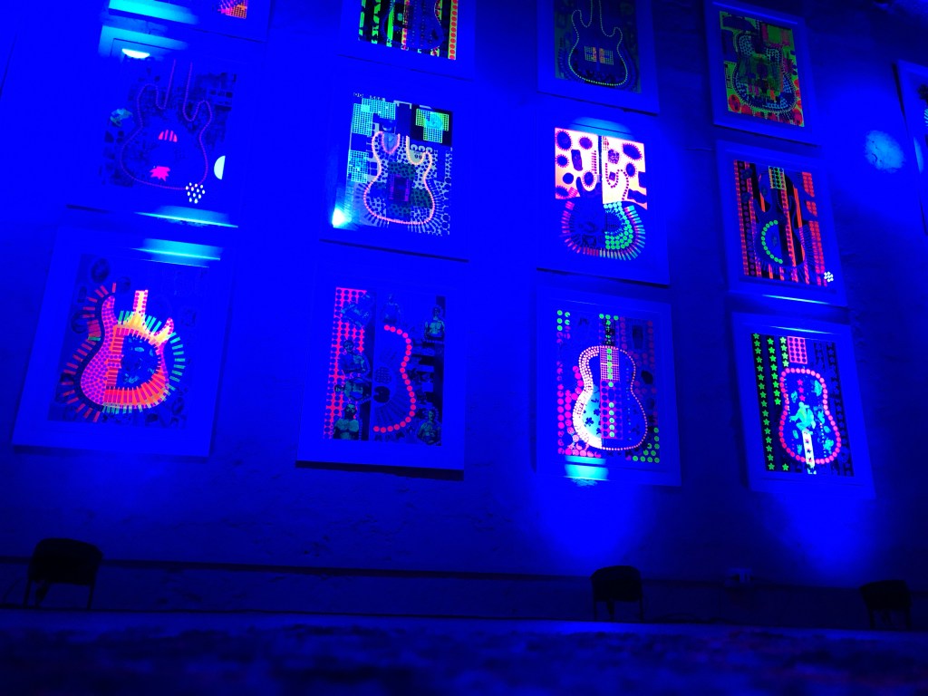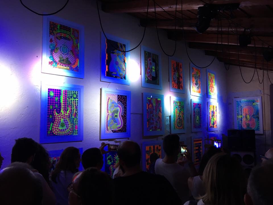 La Fluo Experience di Vittoria Rutigliano è un viaggio psichedelico ispirato dal Rock in tutte le sue declinazioni. Questa serie viene “costruita” nella costante ispirazione della musica, immediatamente riconoscibile dallo scheletro degli strumenti impressi su ogni quadro.