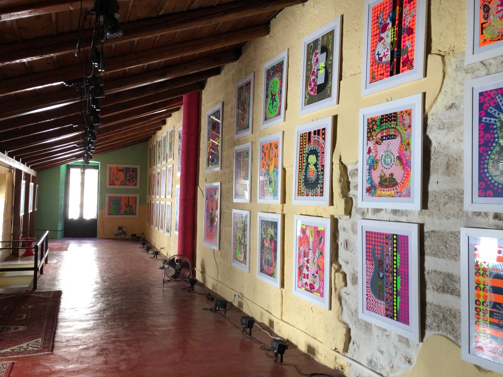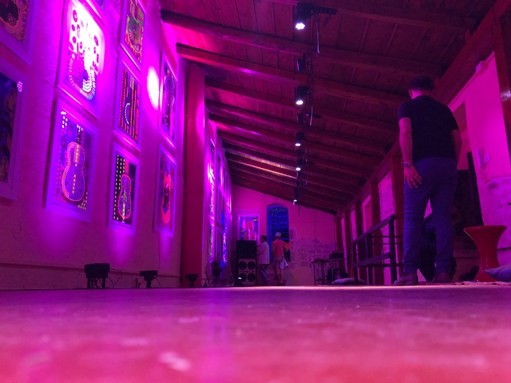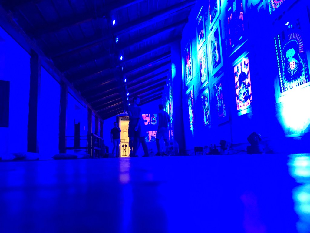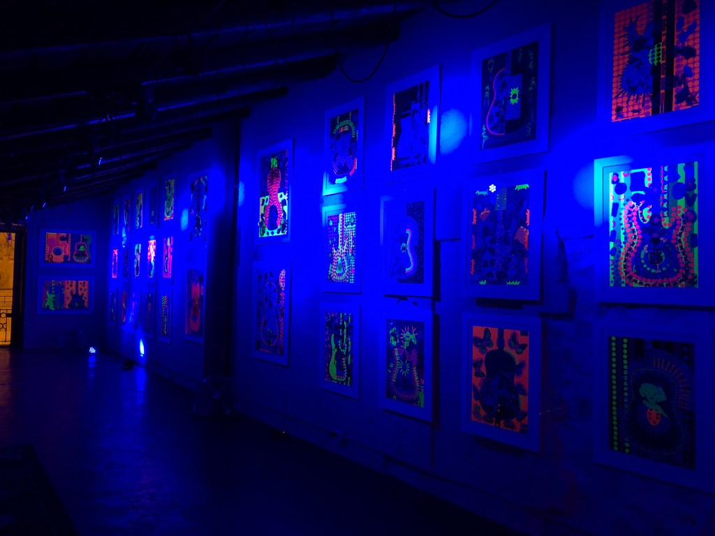 Per iniziare l’esperienza fluo è necessario perdersi nelle centinaia di ritagli che compongono ogni singolo collage, un caleidoscopio di colori e di tipologie di carta che rendono ogni composizione ricchissima di dettagli. Lo stesso caleidoscopio viene mutato in maniera sostanziale dall’irraggiamento di luci blu o viola che trasformano la visione conferendo ai colori fluorescenti il ruolo di protagonisti assoluti.