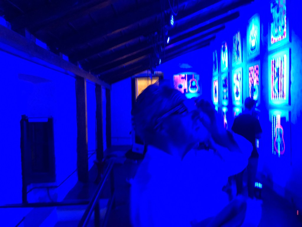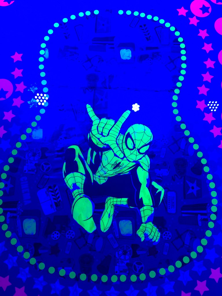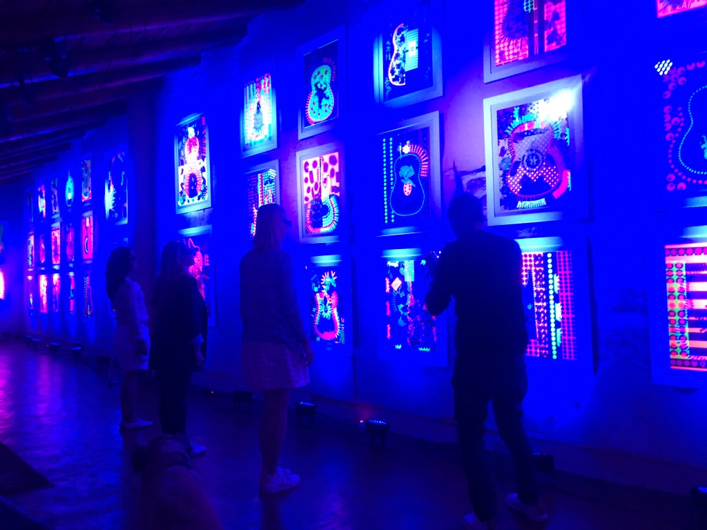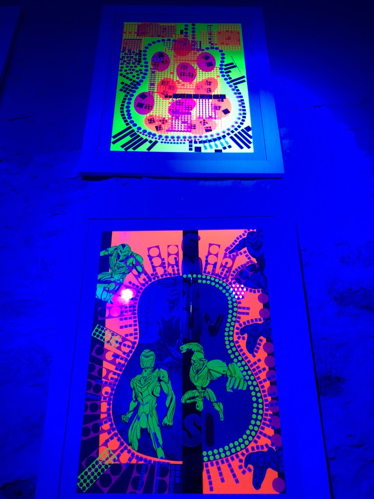 Infine, indossando gli occhiali con lenti ChromaDepth ® in ambiente a luce blu, i quadri raggiungono il loro stadio di ologrammi, completando la Fluo Experience. Non resta che ammirarli, possibilmente con una massiccia dose di Rock. Spesso accade che tornando all’osservazione a luce naturale si è costretti ad affrontare definitivamente l’artista, e la sua abilità di armonizzare la carta.